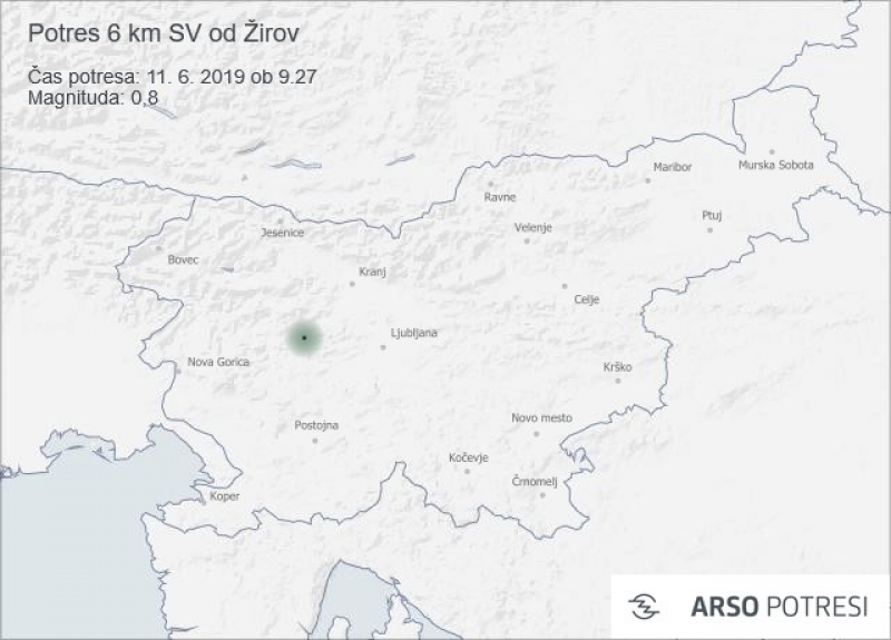 Seizmografi državne mreže potresnih opazovalnic so danes ob 8.54 zabeležili zmeren potresni sunek. Po prvih podatkih je bilo žarišče potresa 26 kilometrov zahodno od Ljubljane, v bližini Žirov, potres pa so čutili prebivalci širšega nadžariščnega območja, so sporočili iz Urada za seizmologijo in geologijo pri Agenciji RS za okolje.