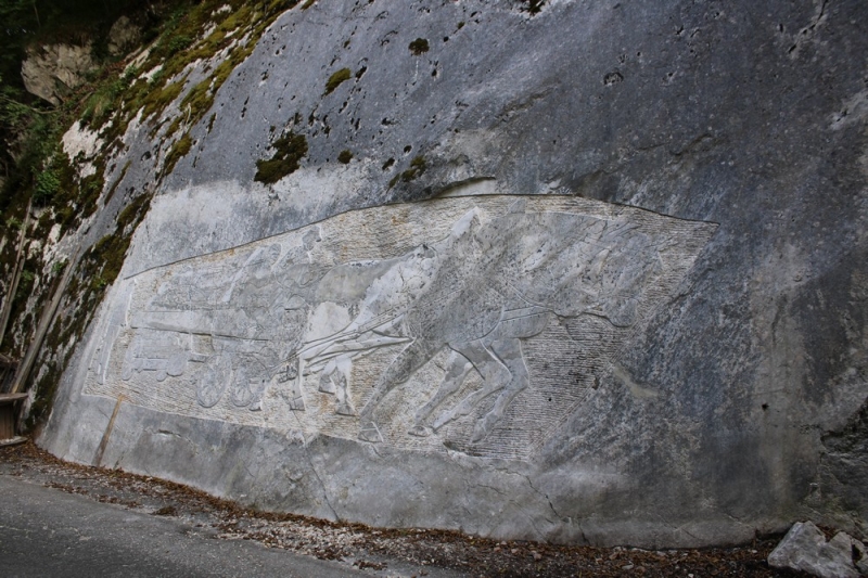 Nizek relief v velikosti 6 krat 2m je prvi v Sloveniji. Osnova za njegov nastanek je bila po besedah kamnosekov slika Bojana Kovača, računalniško jo je obdelal in na steno prenesel Matej Štrancar, strokovno pa svetoval kipar Jure Smole. Z delom so pričeli že leta 2016 končno podobo pa bo relief dobil do zime. Pri izdelavi sodeluje celotna skupina kamnosekov iz Manč, Florjan Bajc, Stanko Fornazarič, Matija Repič, Slavko Likar in drugi.