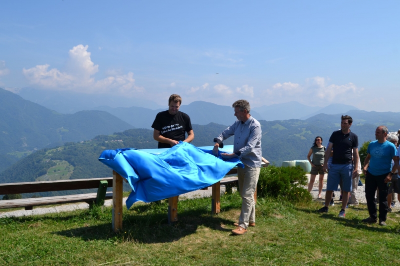 FOTO: Aljaž Bevk (tur. kmetija Široko) in Miha Mlinar (avtor slogana "Lom je moj dom") slovesno odgrinjata novo razgledno tablo na Širokem.