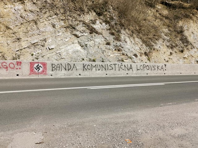 Uporabniki državne ceste na odseku med Godovičem in Logatcem so danes opazili vandalizma, mazaško akcijo na obcestnem zidu okoli 300 metrov pred idrijsko občinsko mejo, proti Hotedršici. Neznani storilci so nanj zapisali žaljivi paroli, ki pozivata k nestrpnosti, zapiranju drugače mislečih, zapisano pa podkrepili s kljukastim križem – simbolom nacizma.
