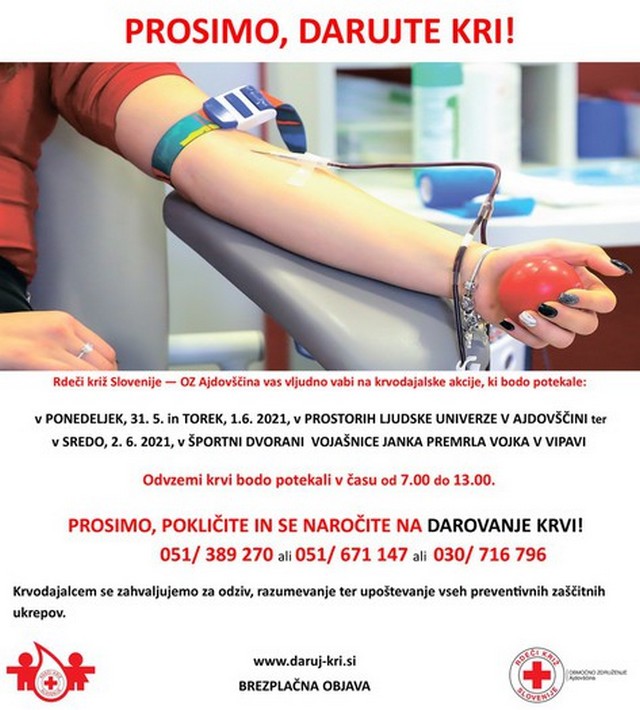 Rdeči križ Ajdovščina ponovno vabi vse, ki so zdravi in izpolnjujejo vse pogoje, da se udeležijo krvodajalske akcije, ki bo potekala v ponedeljek, 31. maja, in torek, 1. junija, od 7. do 13. ure v prostorih Ljudske univerze Ajdovščina.