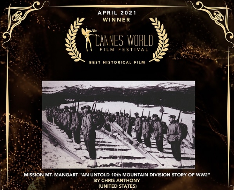 Pred tednom dni smo poročali, da se je dokumentarni film o smučarski tekmi ameriških vojakov na Mangartu režiserja Chrisa Anthonyja uvrstil na znameniti filmski festival v Cannesu, te dni pa je še bolj razveselila novica, da je film Misija Mangart - "Neznana zgodba o 10. gorski diviziji iz 2. svetovne vojne" postal zmagovalec meseca aprila v kategoriji najboljši zgodovinski film.