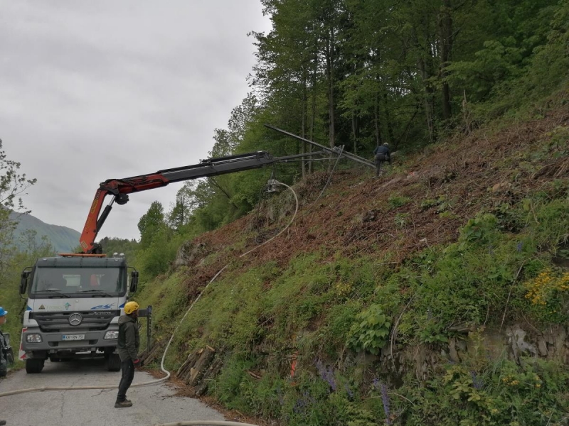 Občina Kobarid je v začetku maja na delu lokalne ceste Vrsno–Krn začela urejati zaščito vozišča pred padajočim kamenjem.