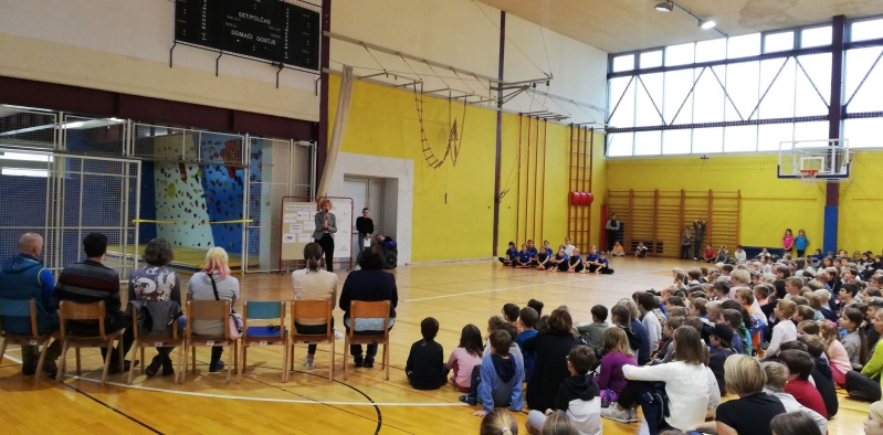 Na OŠ Franceta Bevka Tolmin je bilo danes dopoldne slovesno. Cela šola se je zbrala v telovadnici in prisluhnila posebni prireditvi, s katero so obeležili slavnostno odprtje nove plezalne stene, ki je po večletnem trudu pričakala učence in učitelje v začetku tega šolskega leta.