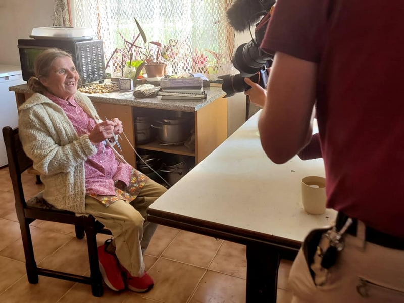 Foto: Jožefa, najstarejša članica rokodelske sekcije DRD Idrija-Cerkno, s fotografoma med pripravami na razstavo (Foto: Tina Zadnik)