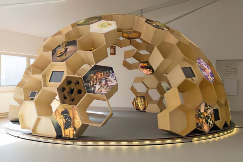 Paviljon je trenutno del stalne razstave v Muzeju Lojzeta Slaka in Toneta Pavčka v Mirni Peči na Dolenjskem, sestavljen pa je iz lesenih šesterokotnikov, ki ponazarjajo čebelje satovje. Pri Čebelarski zvezi so z razpisom iskali novo lokacijo, v Vipavi so se nanj prijavili in po uspešni predstavitvi komisiji paviljon tudi dobili.