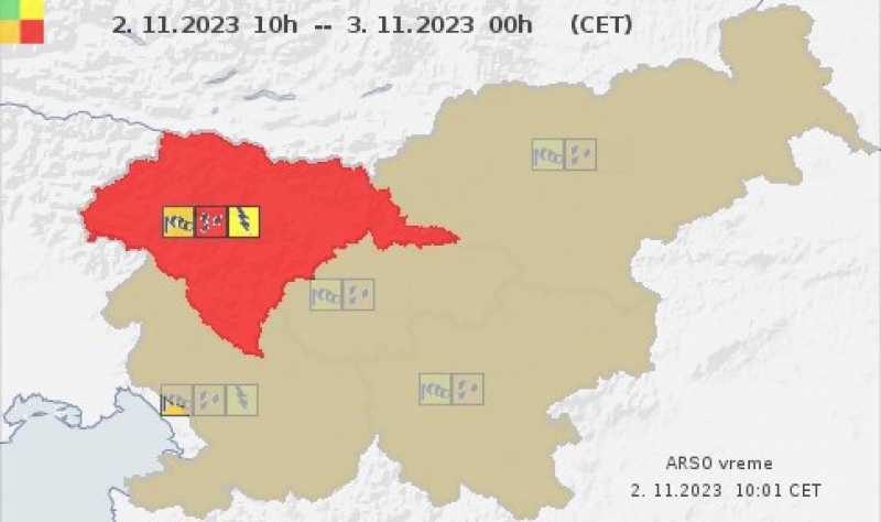 Agencija za okolje RS je danes dopoldan izdala več vremenskih opozoril za Slovenijo. Od opoldneva danes do 6. ure jutri zjutraj je za celo Primorsko v veljavi oranžno opozorilo zaradi močnejših sunkov vetra, za isto časovno obdobje pa je za severovzhod v veljavi rdeče opozorilo glede padavin. V 24 urah lahko pade tudi več kot 150 mm dežja na kvadratni meter.