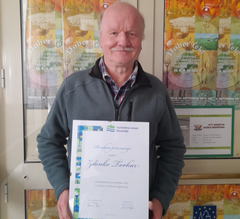 Sledila je podelitev priznanj najzaslužnejšim, ki so jih v društvih in v Turistični zvezi Slovenije prepoznali za predane prostovoljnemu delu. Vsako društvo je lahko predlagalo le enega prostovoljca. Med prejemniki je tudi Zdenko Torkar, član KTT društva Baška dediščina. Svoje prostovoljstvo mu razdaja od leta 2017. Aktiven je pri vseh društvenih prireditvah in akcijah, je tudi društveni turistični vodič. Vseskozi deluje v upravnem odboru, kjer zagovarja trajnostno delovanje društva. Dva mandata je zastopal društvo v organih Zveze društev za tehnično kulturo Posočje Tolmin. Trenutno sodeluje tudi v delovni skupini projekta Gorniška vas Baška grapa. Zavzeto vodenje aktivnosti med društvom in KS Hudajužna-Obloke, katere predsednik je, je obrodilo že štiri turistične produkte. Je dejaven organizator čistilnih akcij, ki pomembno prispevajo k vzdrževanju in ohranjanju kulturne krajine.