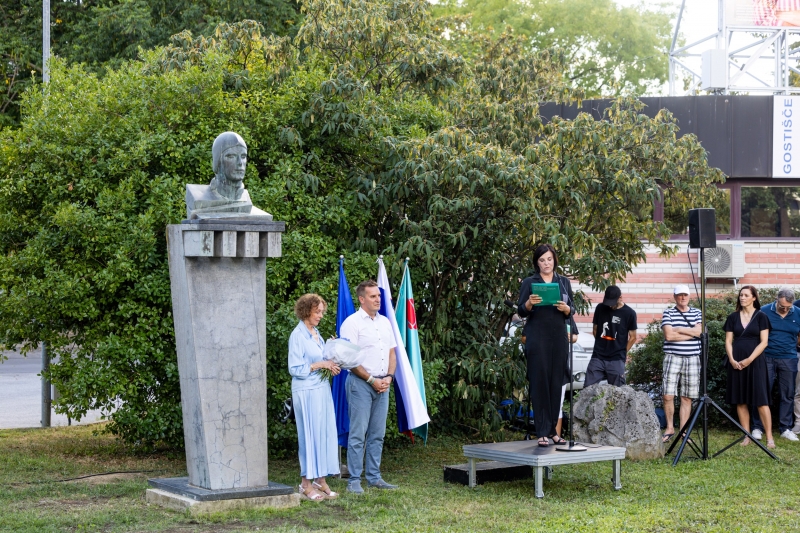 Naslovna fotografija: Župan Samo Turel in Rusjanova nečakinja Grazia Rusjan ob novem kipu. Avtorica: Ana Rojc