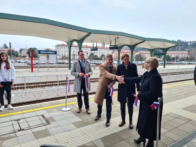Danes so v Novi Gorici slovesno obeležili zaključek prenove železniške postaje, v okviru katere so prenovili notranjost postajnega poslopja, umaknili tovorne tire, zgradili otočni peron, 60 metrov dolg podhod pod tiri, nakladalno rampo za avtovlak in novo parkirišče za 80 avtomobilov z avtobusnim postajališčem. Skupna vrednost del je 61,7 milijona evrov.