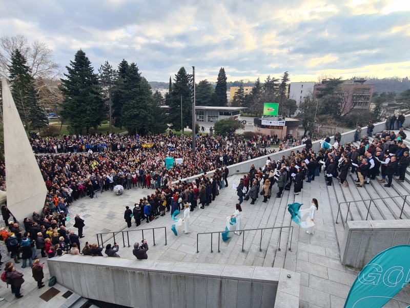 Pri stavbi Krajevne skupnosti Nova Gorica so se jim pridružile še štiri folklorne skupine (dve slovenski, srbska in makedonska), na stopnicah Eda centra pa so nato združeni zapeli pevski zbori Goriške z okrog 200 pevci.