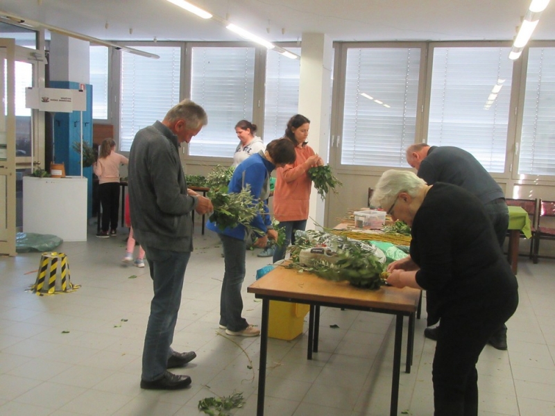 Kulturno tehnično turistično društvo Baška dediščina je tudi letos povabilo na delavnico izdelave cvetnonedeljskih butaric - puslov, že 18. po vrsti. Žalosti dejstvo, da je pušpan, eden od glavnih sestavin cvetnonedeljskega šopa zelenja v gornjem delu Baške grape, zaradi požrešne pušpanove vešče popolnoma izginil iz vrtov večine slovenskih domačij. Zato govorimo o ogroženosti običaja, saj smo vse manj kos naravi, ki na samosvoj način omejuje pogoje za dosledno nadaljevanje praks, znanj in veščin te dediščine. Na delavnici ga zaradi ohranjanja košatega izgleda nadomešča lovor, ki so ga tudi v preteklosti za ta namen skupaj z oljko ponujale po hišah predvsem ženske iz Brd. Izgled siromašijo tudi bršljanove vejice, saj so zaradi datumsko zapoznelih praznikov večino črnih jagod že pojedle ptice. Potem, ko je lani povodenj ob reki Bači odnesla še zadnjo rumeno vrbo, se je tokrat v pretekih letih namensko zasajena vendarle bogato razrasla. Potrebna je za trdno, predvsem pa estetsko povezovanje zelenja. Pomembno je, da se med povijanjem lepo upogiba. Dolgi in tanki ročaji pusla so bili od nekdaj najbolj cenjeni. V društvu so bili še posebej zadovoljni naslednjega dne, ko so na povabilo Kulturno-zgodovinskega društva Lonka Stara Loka promovirali pusl na stojnici Jurjevega sejma v Stari Loki. Mnogi so namreč ob njej zaustavili korak prav zaradi občudovanja precizno izdelanega ročaja. Presenečeni so bili tudi nad opisom sestavin, nad razlago njihove simbolike in nad spoštljivim odnosom ljudi do blagoslovljenega zelenja, ki je celo leto ščitilo dom, domače živali, zemljišča in pridelke in varovalo pred hudimi urami.