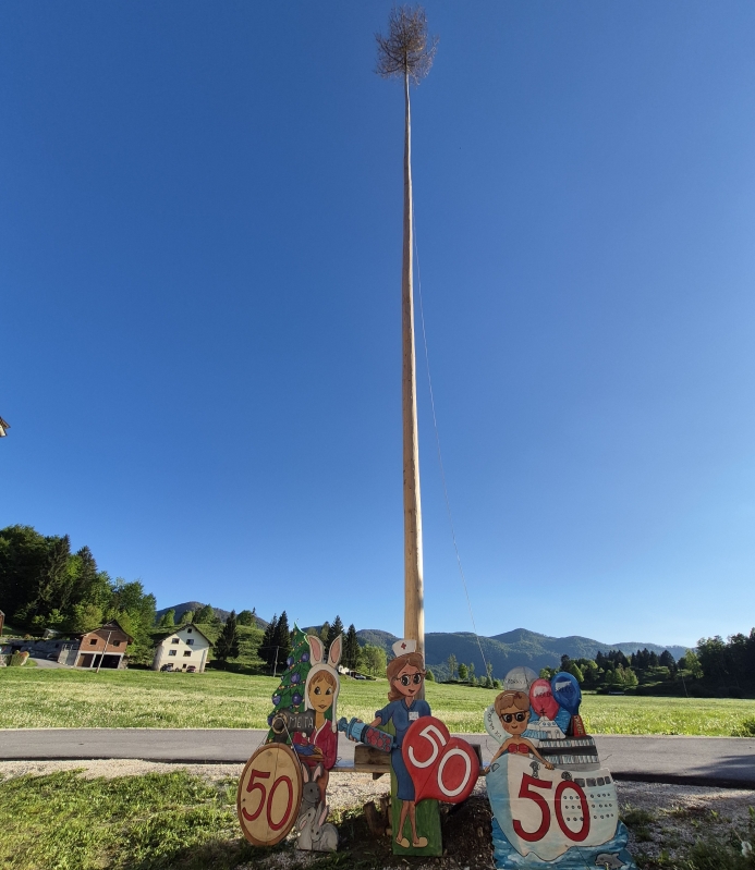 Vrnimo se k mlaju. Zgodba se je začela decembra, ko je bil v gozdu pri Tomšk posekan mogočen mlaj – 18 metrski lepotec, lastniki so Rovtarjevi. Njegova prva postaja je bila Mala Gora, kamor so ga pripeljali na silvestrovo. Tam je krasil dvorišče ob praznovanju 50-letnice, ki je potekalo na novega leta dan. Vrhunec praznovanja je bil prav pogled na mogočen mlaj, ki je bil osvetljen z novoletnimi lučkami in ustvarjal posebno vzdušje. Ker je slavljenka Meta v šali dejala, da bi bilo prav, da se po 50 dneh mlaj pospravi, je kmalu zatem sledila nova ideja. V duhu trajnosti in ekološke miselnosti so mlaj razstavili, nekoliko olepšali in zamenjali vrh ter ga februarja postavili v Predgriže k Zinki, kjer je ponovno krasil praznovanje 50-letnice.