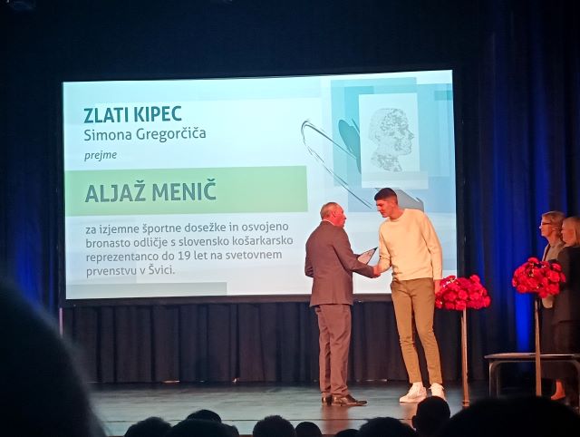 Mladi košarkar Aljaž Menič je za izjemne športne dosežke in osvojeno bronasto odličje s slovensko košarkarsko reprezentanco do 19 let na svetovnem prvenstvu v Švici osvojil zlati kipec Simona Gregorčiča: