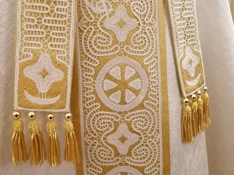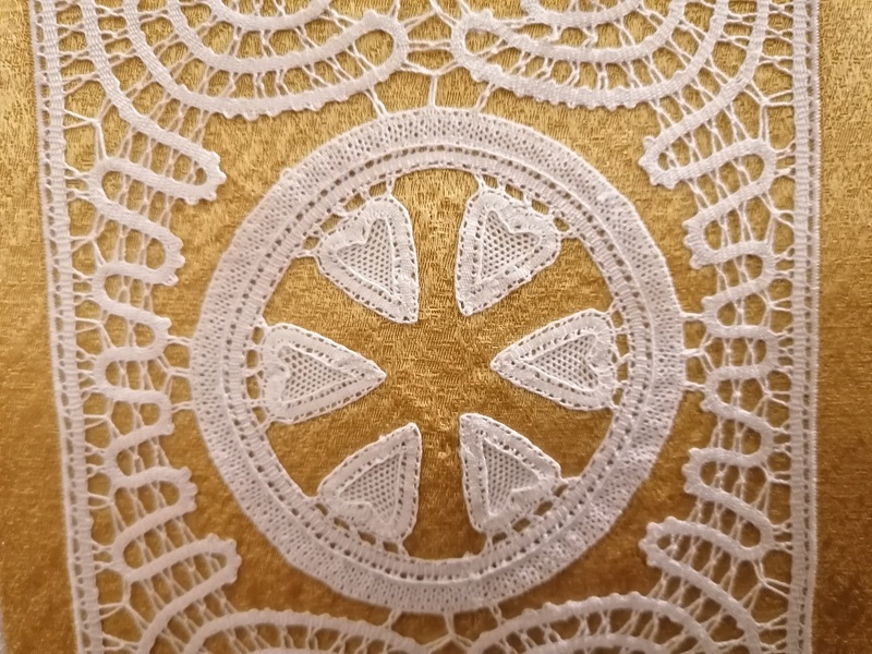 sporočilo. V čipko vnešeni krščanski simboli delujejo kot celota, sporočilo enosti.