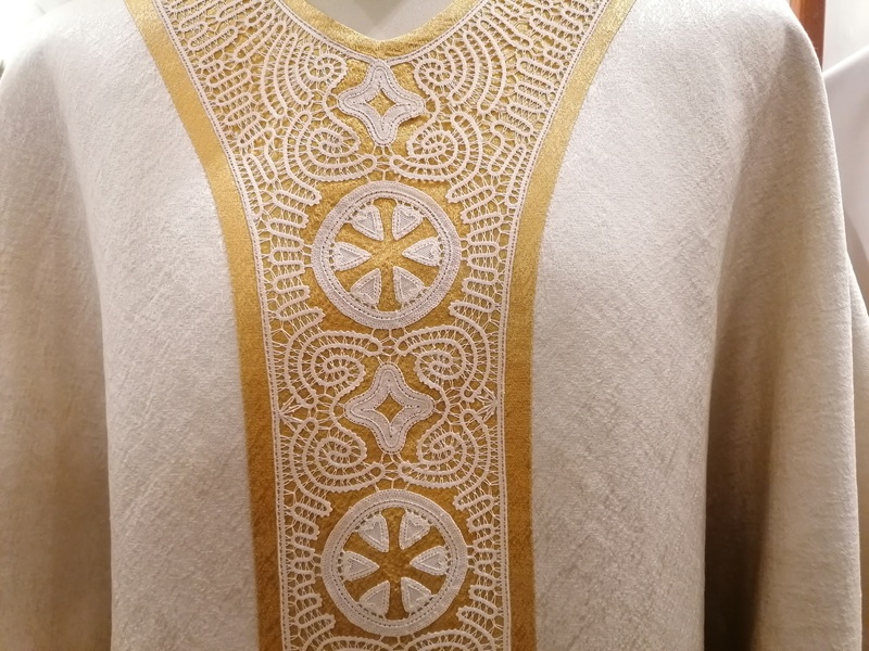 Nekoliko drugačen kroj za papežev mašni plašč v zlato-beli barvi z idrijsko čipko je oblikoval krojač Matej Peljhan, ki je doslej izdelal že 66 mašnih plaščev, spremenil je zlasti obliko porte-centralnega sprednjega dela na mašnem plašču, kjer so nanizani cerkveni simboli. Ta je običajno ravna, on pa jo je zasnoval v obliki keliha.