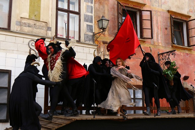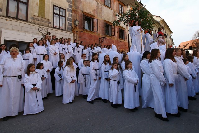 Škofjeloški pasijon je prav ta procesija, ko se ti koraki spremenijo v oder. Več sto ljudi se premika skozi več mestnih ulic.
