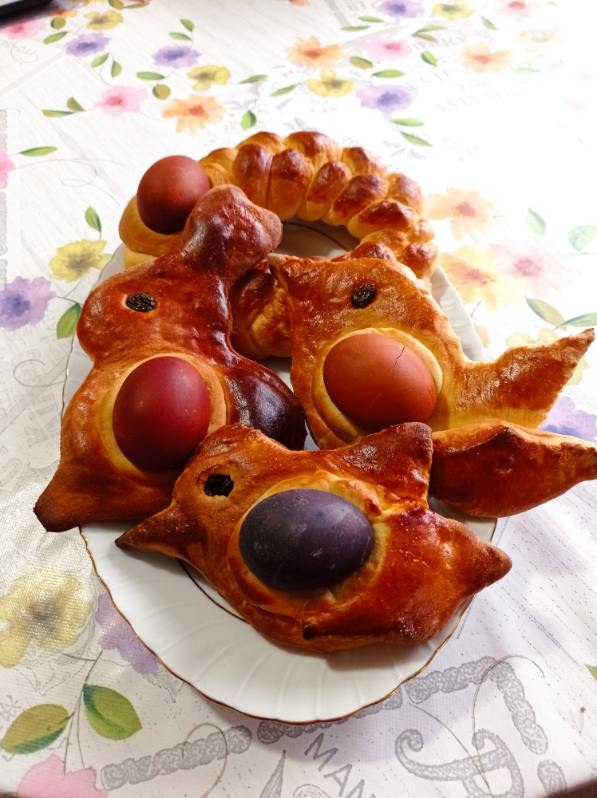 Marija in Rado Lapanja še vedno vsaj enkrat na mesec pečeta kruh v krušni peči, za veliko noč pa so na mizi tudi druge praznične dobrote (Vir: Osebni arhiv)
