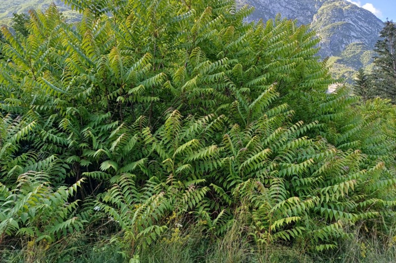 Veliki pajesen (Ailanthus altissima) se širi ob gozdnih robovih, cestah in rekah ter spada med invazivne tujerodne vrste v EU (Foto: Geopark Idrija)