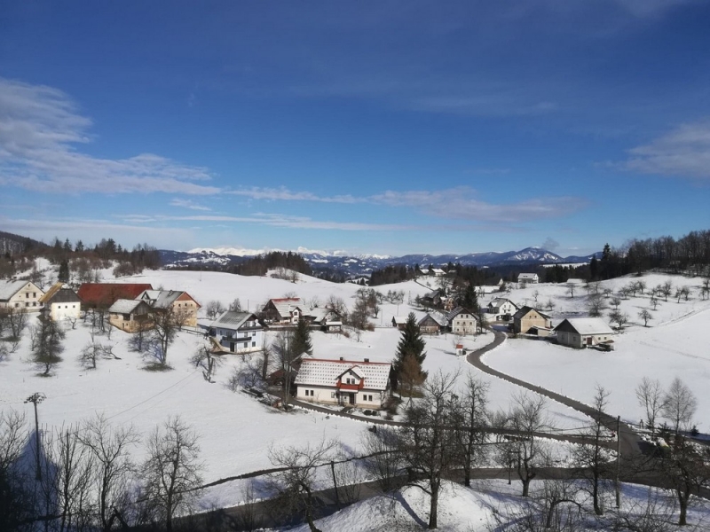 širen razgled čez predalpsko hribovje, vse do Triglava, Karavank in