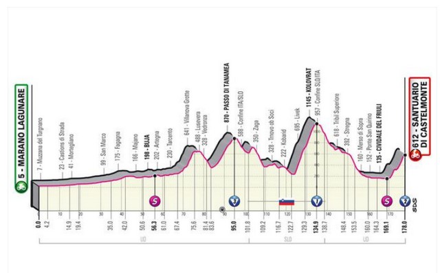 Etapa se prične v Marano Lagunare in kolesarje vodi do cilja na Castelmonteju oziroma na Stari gori. V etapi bodo morali kolesarji premagati kar 3230 višinskih metrov. Med 102 in 135 km bo trasa potekala po Sloveniji - prek Trnovega ob Soči se bo trasa spustila do Kobarida, od koder bo sledil zahteven desetkilometrski vzpon na Kolovrat s povprečnim naklonom skoraj deset odstotkov.