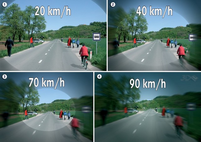 Prikaz, ko so nam zoža zorni kot ob povečevanju hitrosti: