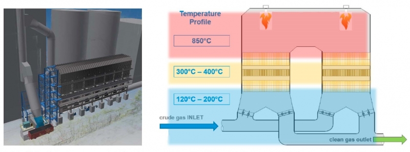 Fotografija: Vizualizacija in operativna shema načrtovane naprave za dodaten sežig dimnih plinov // vir: Salonit Anhovo