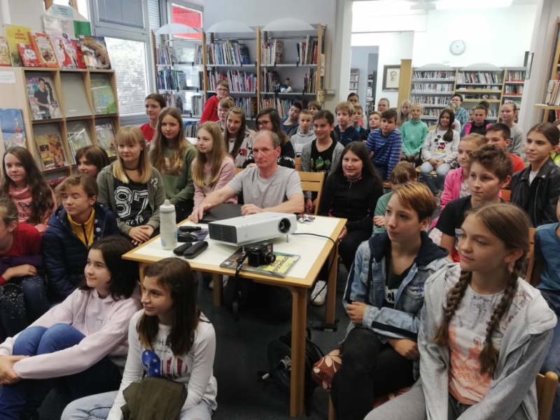 Foto: Ermin med sedmošolci OŠ Cerkno v Bevkovi knjižnici v Cerknem
