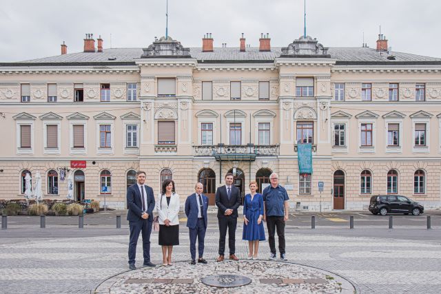 Z leve: Gorazd Božič, v.d. direktorja Zavoda GO! 2025, podžupanja MO Nova Gorica Damjana Pavlica, odbornik za kulturo Občine Gorica (I) Fabrizio Oretti, župan dr. Klemen Miklavič, ministrica dr. Asta Vrečko, državni sekretar na Ministrstvu za kulturo mag. Marko Rusjan