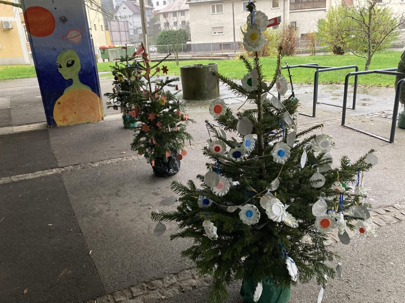 Učenci v Idriji so okrasili devet smrečic na katerih so okraski, ki so jih učenci izdelali iz odpadnih jogurtovih lončkov, zamaškov, jogurtovih pokrovčkov, odsluženih zgoščenk, odpadnik pokrovov, odsluženih lesenih perlic, odpadnih tulcev in ostankov volne. Učenci v Spodnji Idriji so okrasili tri smrečice, ki jih krasijo okraski odtisov barvnih lučk, okraski iz orehovih lupin in lesa. Smrečice si lahko ogledate pred obema osnovnima šolama.