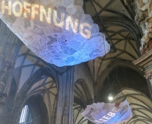 Foto: Eva Petrič ("emocionalni oblaki" Liebe, Glaube, Hoffnung v Štefanovi katedrali na Dunaju spomladi 2016)