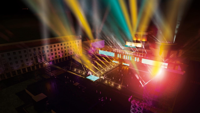 Foto: Grafični prikaz svetlobnih efektov na prizorišču pred občinsko stavbo