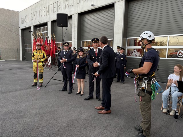 V Ajdovščini so včeraj slovesno odprli nov sodoben Gasilski center, ki pod eno streho združuje Prostovoljno gasilsko društvo Ajdovščina, Gasilsko reševalni center ter Gasilsko zvezo Ajdovščina. Trak so slavnostno prerezali župan Občine Ajdovščina Tadej Beočanin, direktor GRC Ajdovščina Blaž Mlečnik, predsednica PGD Ajdovščina Neli Kovšca in predsednik GZ Ajdovščina Matic Stibilj.