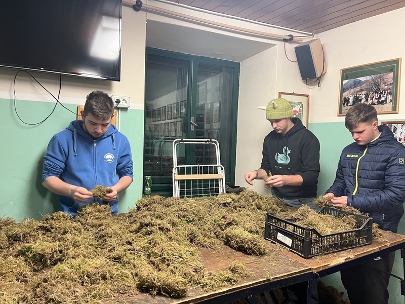 Za tri Laufarje se obleka našije vsako leto na novo, mladi člani na sliki izdelujejo obleko Pusta.