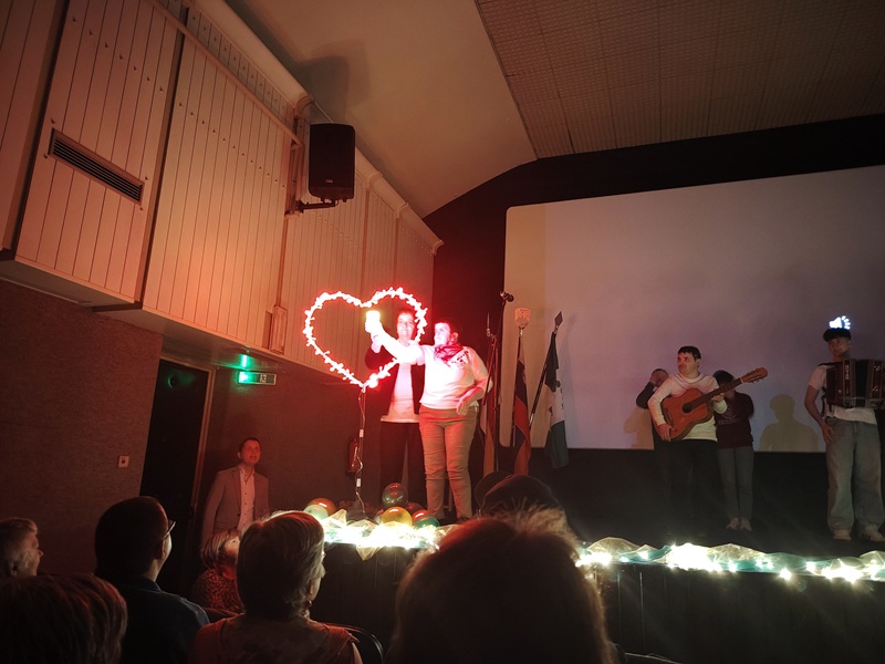 Slovesno okrašen, še rahlo zatemnjen oder in društveni bend, ki na njem že čaka na začetek. Zatem se na oder ob spremstvu prostovoljke povzpne članica društva Sožitje in s svečko simbolično prižge rdeče srce, ki zažari na odru.