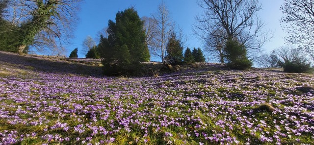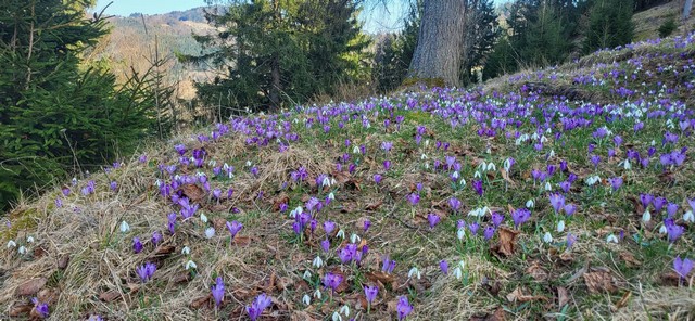 Te dni smo v Botaničnem vrtu UL gostili kolege iz Dunajskega Botaničnega vrta in iz Škotske. Niso se mogli načuditi poljanam žafranov, ki so vsepovsod po Cerkljanskem in Idrijskem, kjer smo se vozili se ustavljali in opazovali te prekrasne poljane ali pa male zatrepe ob potokih ki so bili povsem vijolično – modri. Le slikar bi znal povedati vse odtenke. Morda ne vemo, da so bile še pred 25 leti te mnoge površine zelo intenzivno gnojene. Tam so bili samo temno zeleni travniki z morda komaj 15 različnimi vrstami. Z opuščanjem intenzivnega gnojenja, z začetkom paše ovac, pa s je to v 20 letih povsem spremenilo. Vijolične modre poljane nepregledanega števila cvetov so. To se lahko zgodi samo v primeru, da imamo v bližini še nekaj ostankov tega. Tega pa z opuščanjem tradicionalne krajine in samo še intenzivnim gospodarjenjem kmalu tudi pri nas ne bo več mogoče. Prav to so bila vprašanja tujcev. Kako lahko to še imamo, koliko časa traja? In navdušeni so bili nad našimi razlagami kako lahko krajno beremo. Ko smo se na lokaciji potem ustavili so to razumeli. Še tam kjer se na prejšnjih travnikih nato pašnikih ponovno pase govedo, se žafrani niso povsem umaknili, le v rede so se postavili, kot da bi bili na njivi posejani z pšenico. Žafrani imajo raje imajo pašo ovac, ker so ovce lažje in manj steptajo zemljo. Zvončki, ki so še vedno v cvetu na teh nekoliko višjih legah, okrog 700 do 800 m, pa paše ne marajo, zato so bolj na obrobju. Žafrani pa imajo radi malo težja in vlažna tla. Tam kjer se po cerkljansko idrijskem pase drobnica, je res te dni podoba najlepša. Splača se zapeljati med te nepregledne poljane. Res so žafrani malo krajšega diha, če je vreme zelo spremenljivo, niso tako trdoživi kot zvončki, a v takem suhem marčevskem vremenu so v soncu nenadomestljivi. Čebele se dobesedno valjajo v žafranih. Se sploh zavedamo koliko te male in drobe rastline prinesejo naravi kot celoti, vsem opraševalčevem in še posebej čebelarjem. Za zvončke smo prav v Botaničnem vrtu Ul z dr. nalogo Katje Malovrh, dokazali da en hektar zvončkov lahko prinese kar 2,5 dcl nektarja, ena izmed tujih raziskav pa doda še, da lahko zvončki proizvedejo preko 9,36 kg samo peloda na hektar. Oboje je zelo pomemben podatek pa je le nekaj izmed niza vsega kar je bilo obdelano. Kaj potem počnejo žafrani, ki ponekod celo malo dišijo po medičini. Da je temu tako pa se vidi tudi v povsem rumenih čebelah, ki pridejo iz njih cvetov.